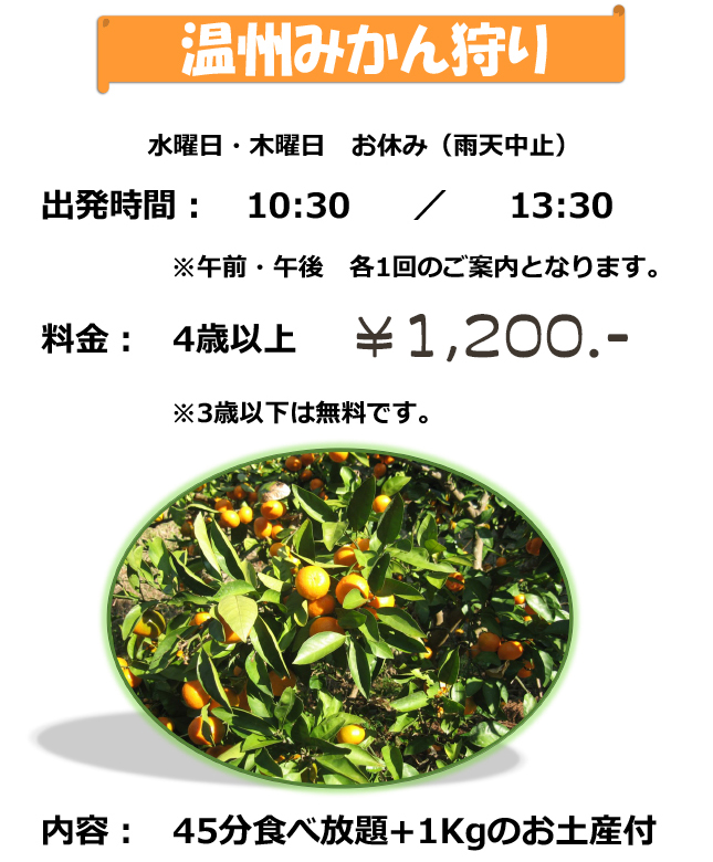 鴨川の温州みかんは甘酸っぱくて味が濃いみかん。みかんには健康を保つために必要な栄養成分がたくさん含まれています。生産者さんの農園での摘み取り体験です。農園までスタッフが車で先導します。みかん狩りでおいしいみかんをたっぷりとお召し上がりください。