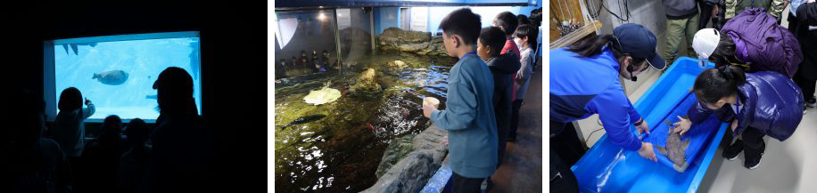 ①シャチの観察 ガラス面の前でシャチを観察しながら、特徴や能力について飼育員が解説します