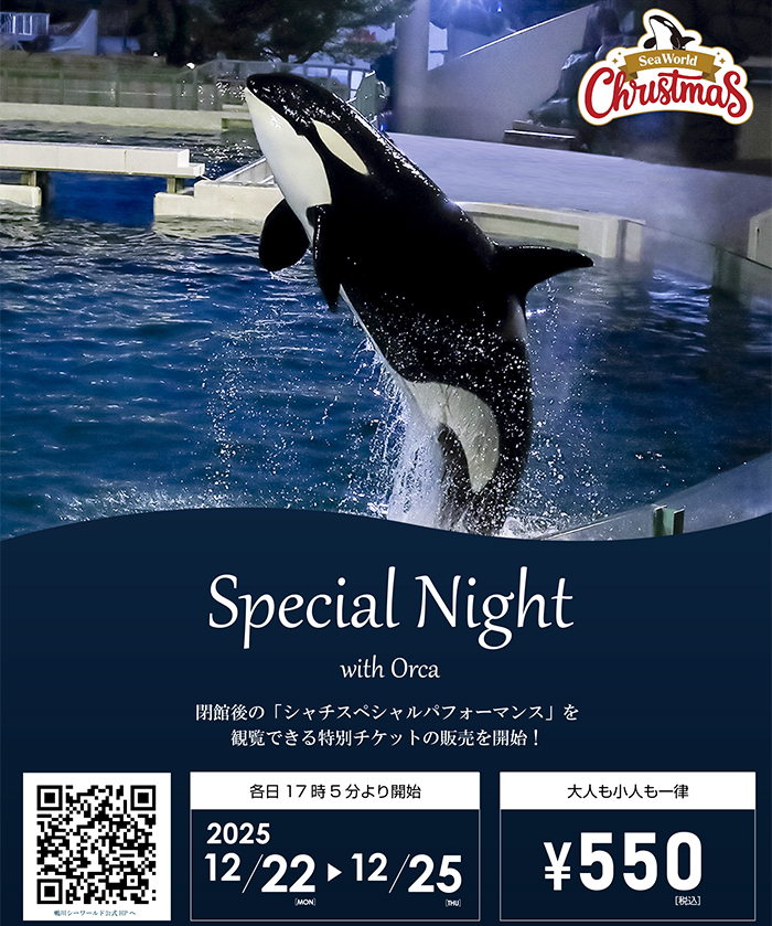 閉館後に行なわれるシャチスペシャルパフォーマンス「Special Night with Orca」。今年は55周年を記念して多くのお客様にご覧いただく為、数量限定でスペシャルパフォーマンスの特別チケットを発売。