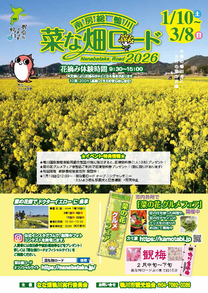 鴨川温泉旅館業協同組合提携の宿にご宿泊のお客様、菜の花グルメフェア参加店ご利用のお客様に「花摘み無料券」(1人10本)プレゼント