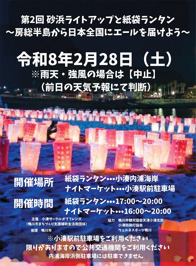 小湊内浦海岸で紙袋ランタン並びに小湊駅前駐車場にてナイトマーケットが開催されます。想いを込めた紙袋ランタンを砂浜に並べ、自然災害により困難な状況にある全国の方々へ、房総半島・小湊からエールを届けるイベントです。