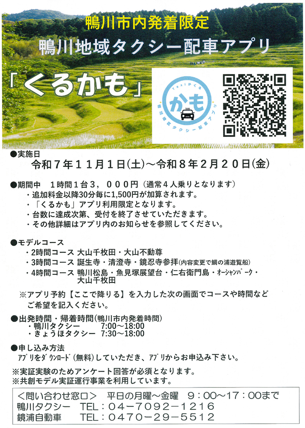 アプリを使ってすぐにタクシーを呼べる!タクシーで鴨川市内の観光スポットを訪れよう。
