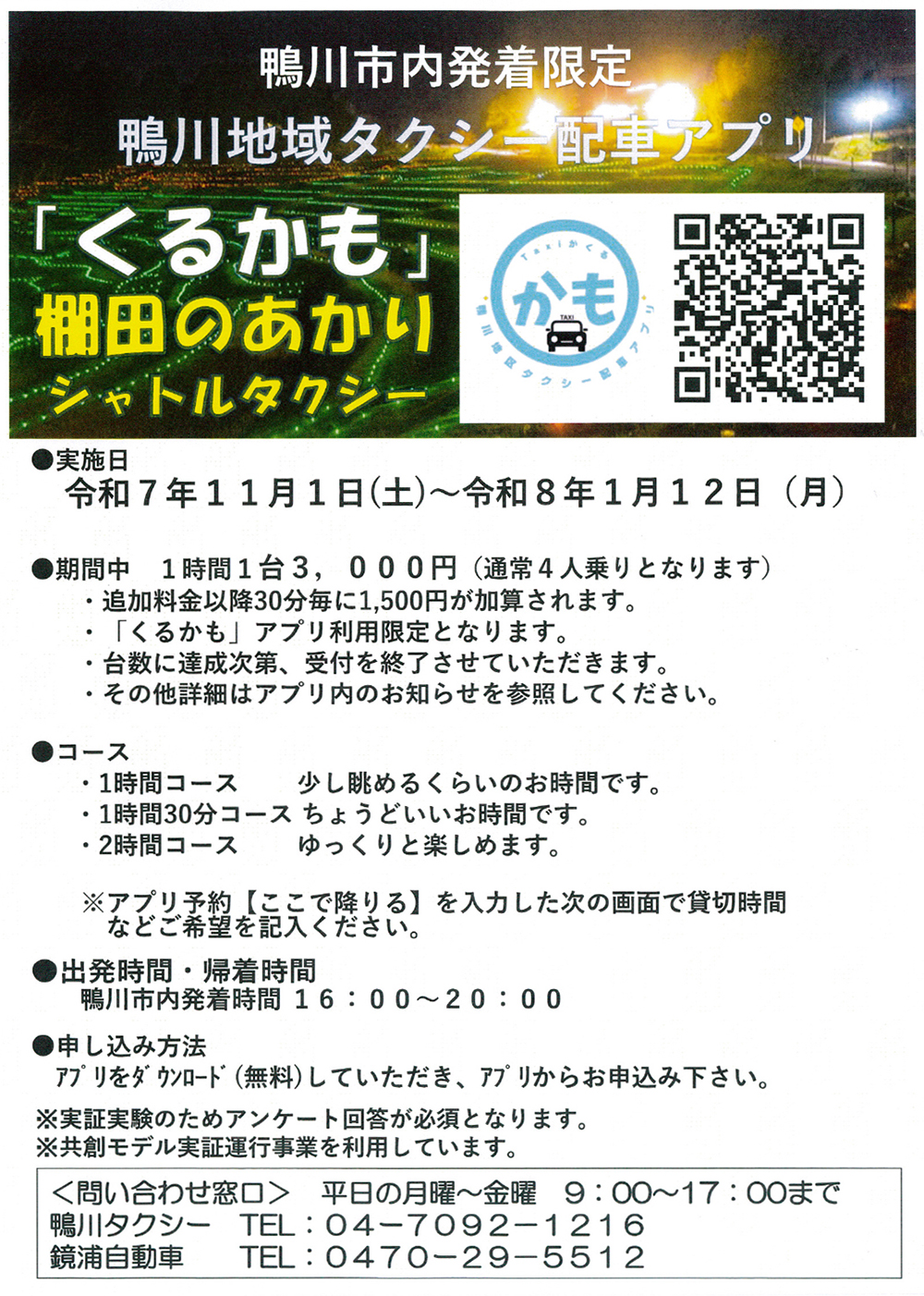 「棚田のあかり」を見に行くにもタクシーが便利。16:00 - 20:00の時間でご利用可能です。