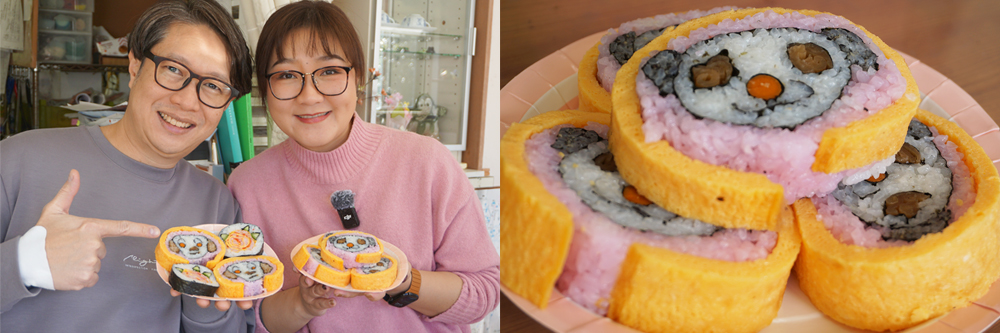 房総半島の農家の方々が冠婚葬祭や祝い事の時に、おむすび・おにぎりではなく「巻物」を振る舞ったことが始まりだそうです。「太巻き祭りずし」の特長は、すし飯や多種多様な具の配置を、逆さ絵で組み上げていく独特な手法により作り出されるところです。図柄は、花や動物、文字、景色など色々あります。完成後に包丁で切った時に現れる図柄に感動の声が・・・。